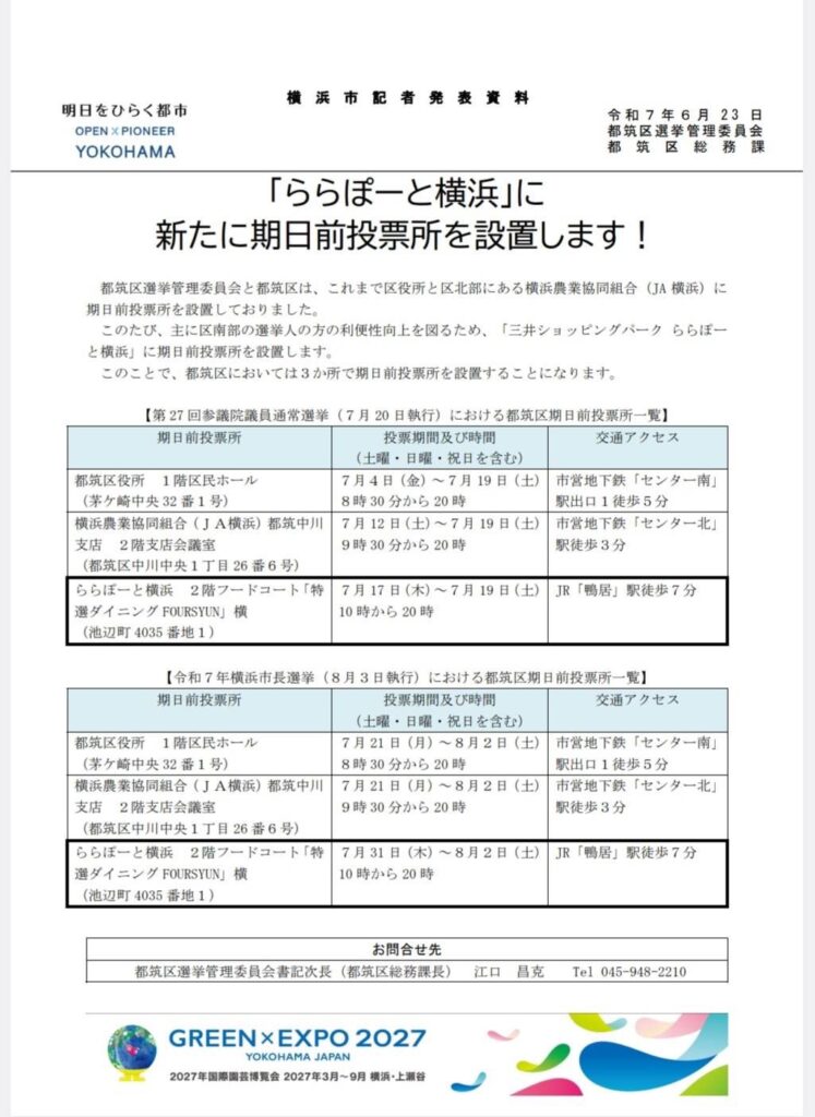 市来えみこ2025-07-09【都筑区役所】 期日前投票に 行ってきました🗳️ GREENxEXPO 2027の キャラクター トゥンクトゥンクも ありました✨ 今回は、最後の3日間に 「ららぽーと横浜」の2階でも 投票🗳️出来ます🤗 #都筑区 #市来えみこ