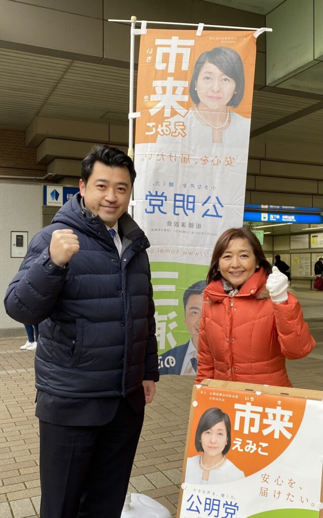 仲町台駅で朝の街頭。