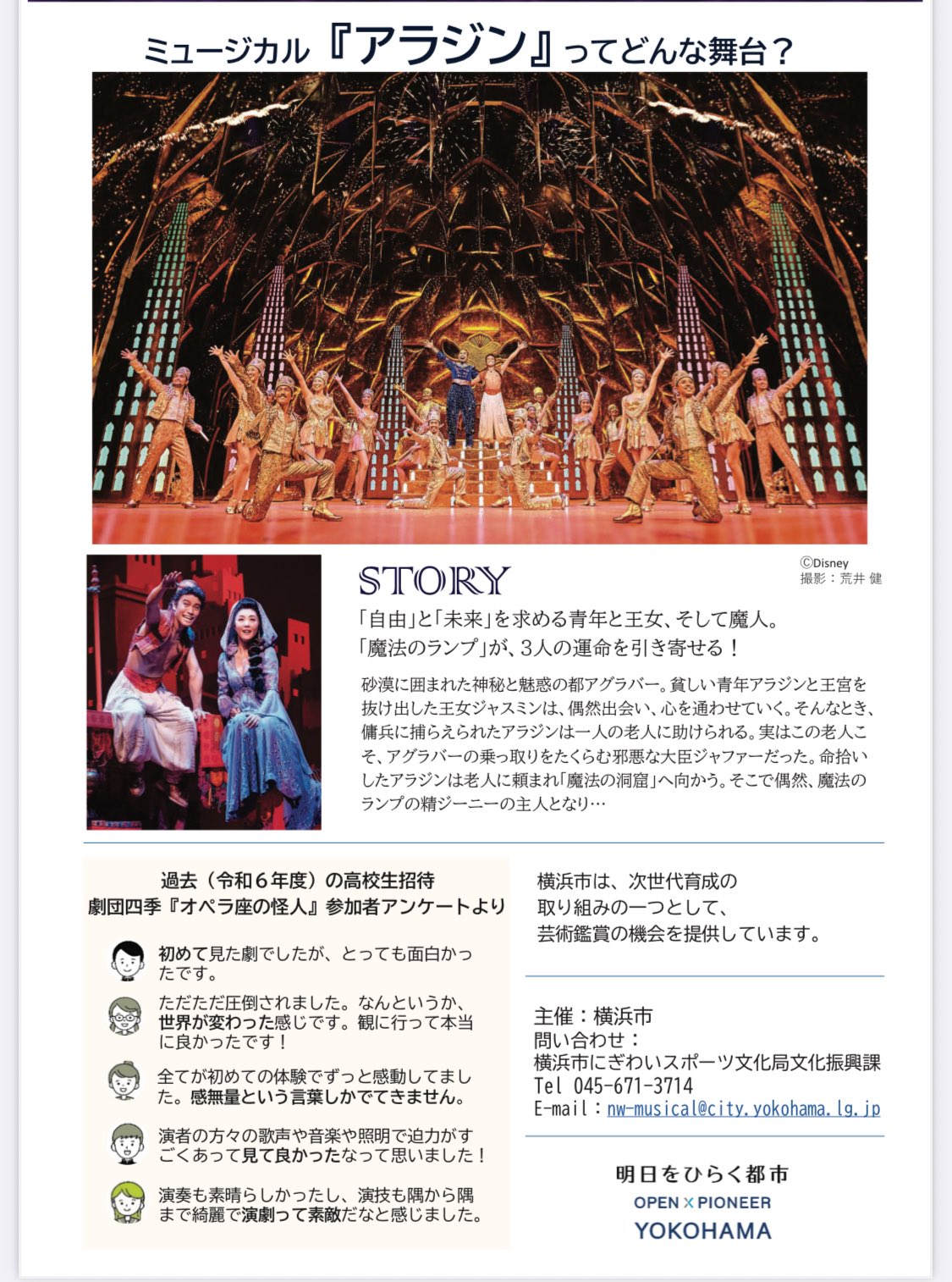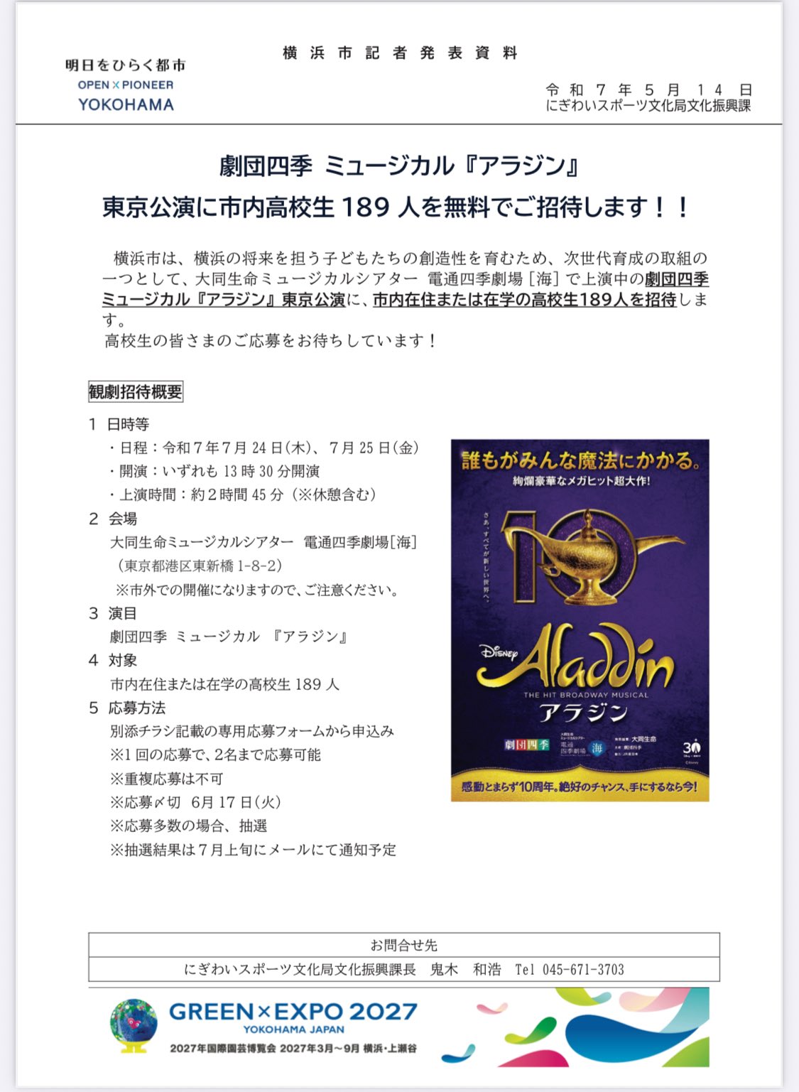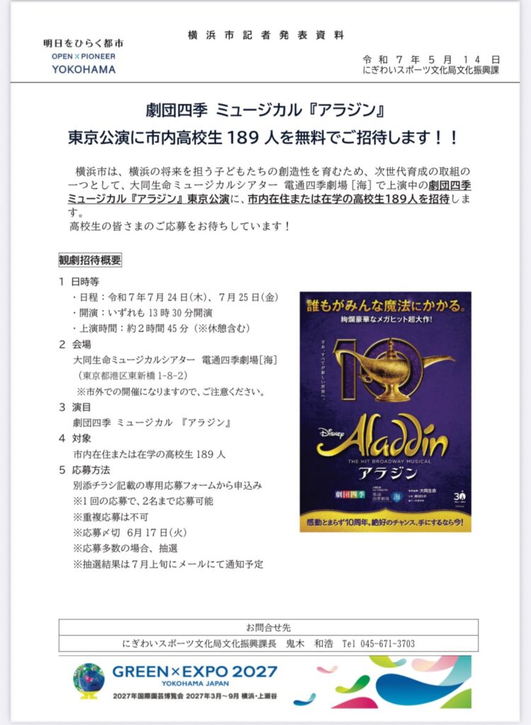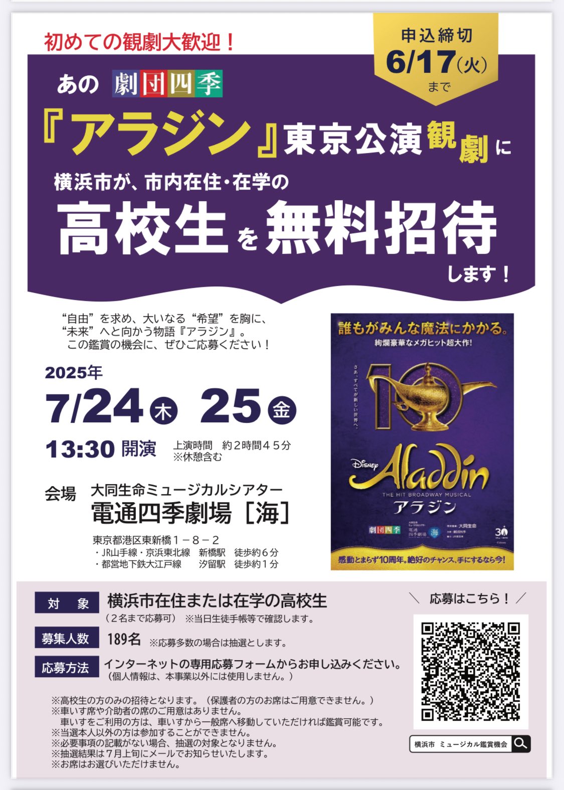 市来えみこ2025-05-17【アラジン🪔】 #劇団四季 の #アラジン 鑑賞を 市内の高校生 へ公募します‼︎ ぜひ2次元コードから 申込みを✨ 当たると良いですね❗️ #横浜市 #公明党 #横浜市会 #都筑区 #市来えみこ