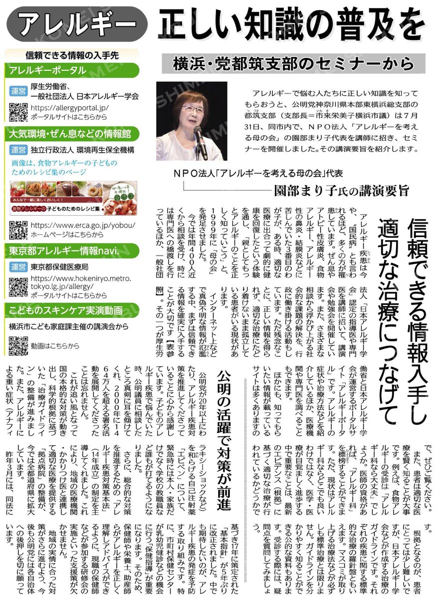 【アレルギーのセミナー】#都筑区公明新聞で掲載されました!(Women&Youth)アレルギーの正しい知識の普及を/横浜・党都筑支部のセミナーから/NPO法人「アレルギーを考える母の会」代表 園部まり子氏の講演要旨 #公明新聞電子版 2023年08月29日付 Twitterで表示