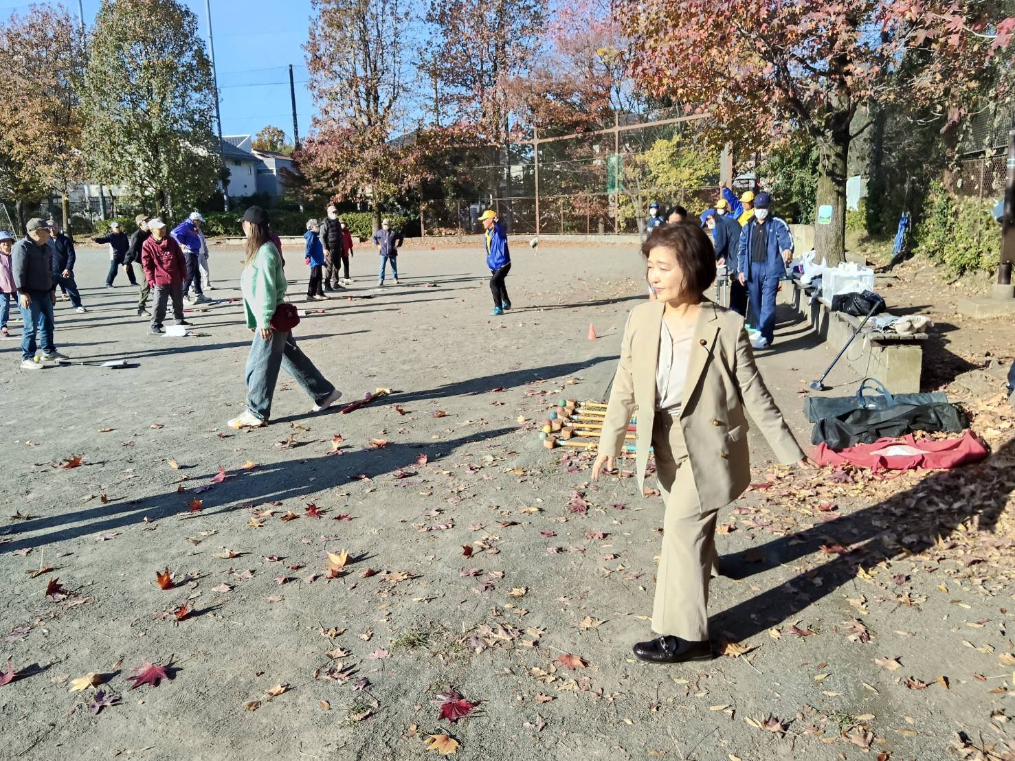 市来えみこ2025-11-16【グランドゴルフ】 #勝田 秋深まる🍂 美しい公園 早朝からGゴルフで 身体を鍛える皆様と 準備体操、 応援のご挨拶を させていただきました⛳️ #公明党 #市来えみこ #都筑区