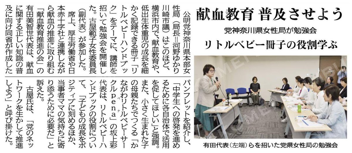 市来えみこ2023-08-27【公明党神奈川県本部女性局】先日、ご講演いただいた#献血教育#リトルベビーの記事が、#公明新聞に掲載されました✨献血教育を普及させよう/リトルベビー冊子の役割学ぶ/党神奈川県女性局が勉強会 #公明新聞電子版 2023年08月27日付 Twitterで表示