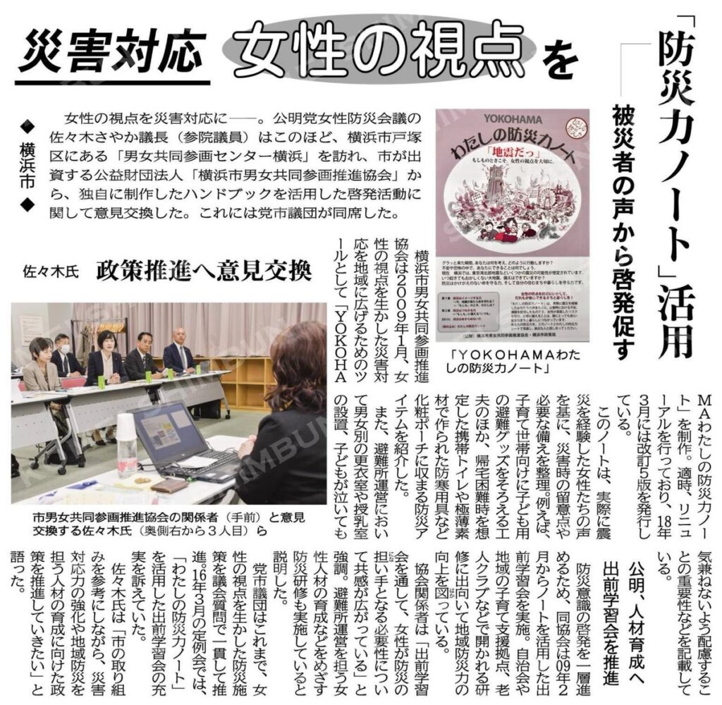 【公明新聞】5/5付の4面に、先日の視察の様子が掲載されました 災害対応に女性の… 2024-05-07 by 市来 えみこ 【公明新聞】5/5付の4面に、先日の視察の様子が掲載されました🆙災害対応に女性の視点を/佐々木氏、政策推進へ意見交換/横浜市 #公明新聞電子版 2024年05月05日付