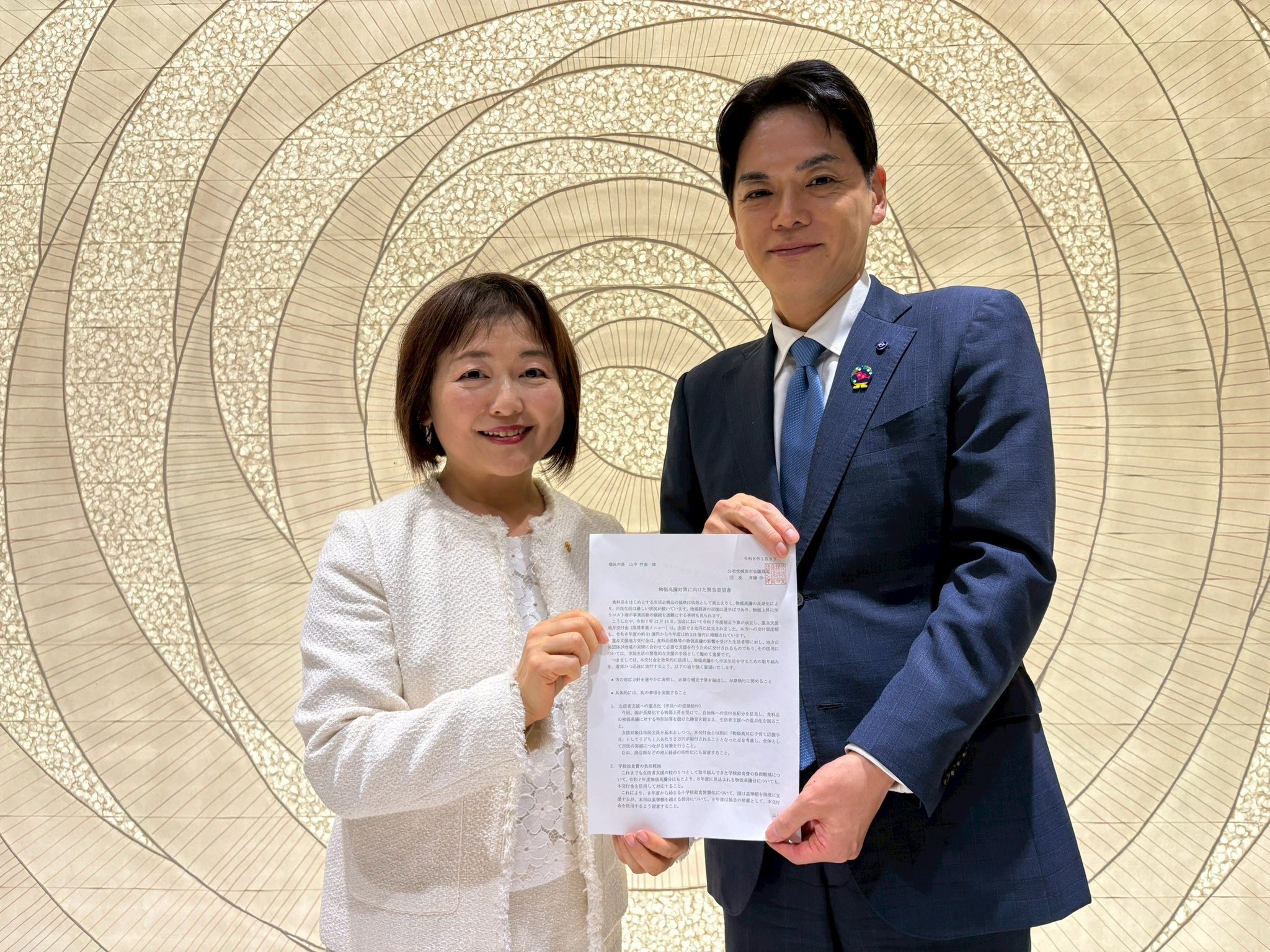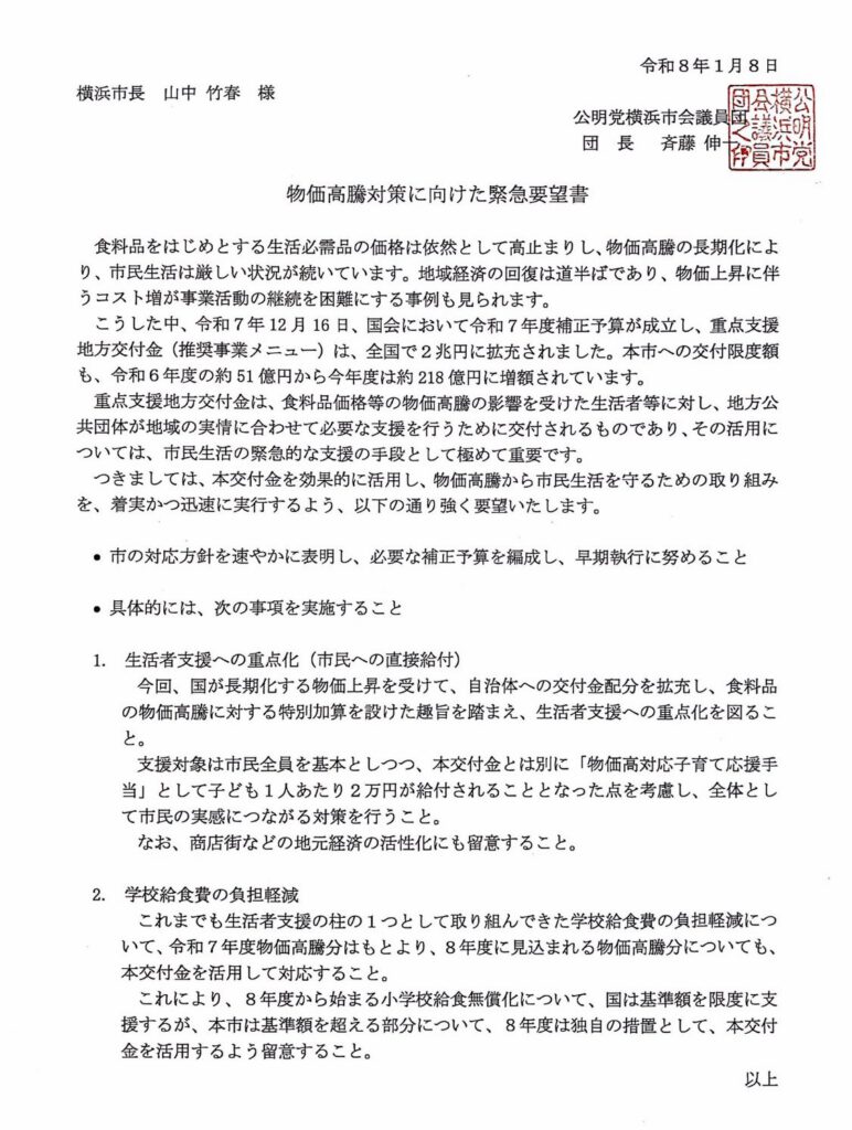 市来えみこ2026-01-09【山中市長へ提出】 1/8 #公明党 横浜市会議員団は 山中市長へ 「物価高騰対策に向けた 緊急要望書」 を提出しました📃 国から約218億円の交付金 貴重な財源を 市民の皆様の生活を守るために✨ #市来えみこ #都筑区