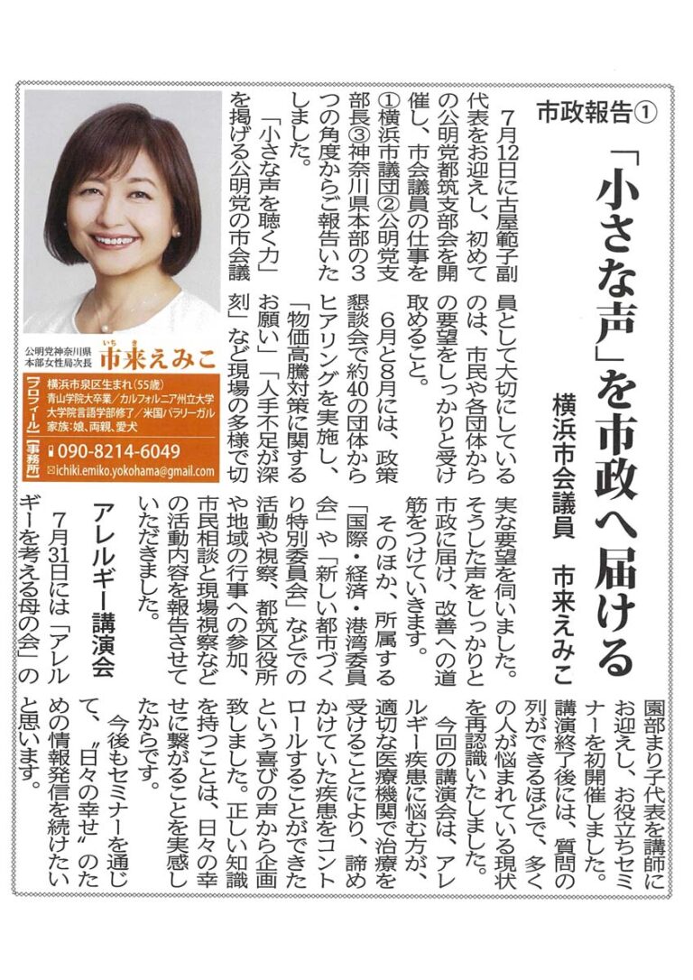 7月12日に古屋範子副代表をお迎えし、初めての公明党都筑支部会を開催し、市会議員の仕事を【1】横浜市議団【2】公明党支部…