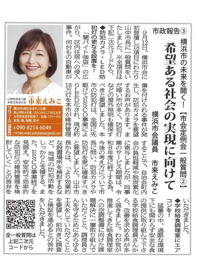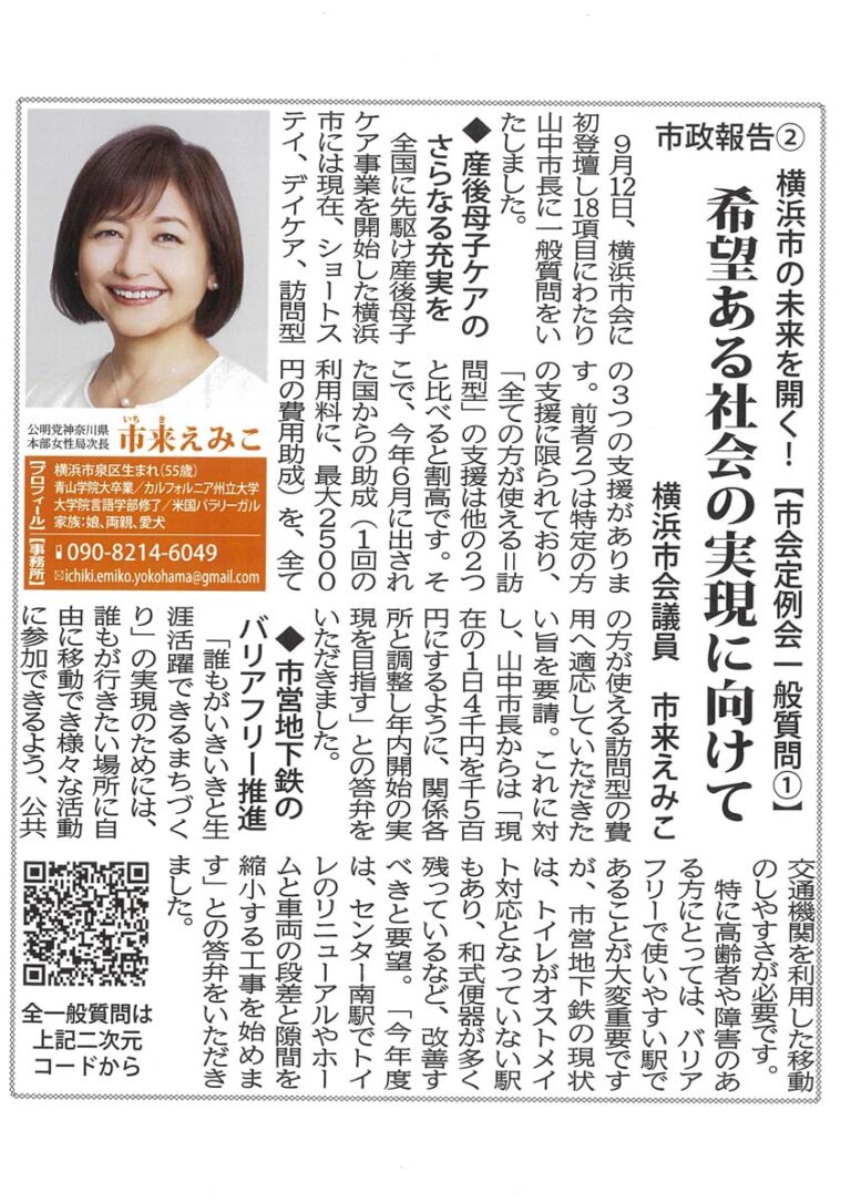 9月12日、横浜市会に初登壇し18項目にわたり山中市長に一般質問をいたしました。