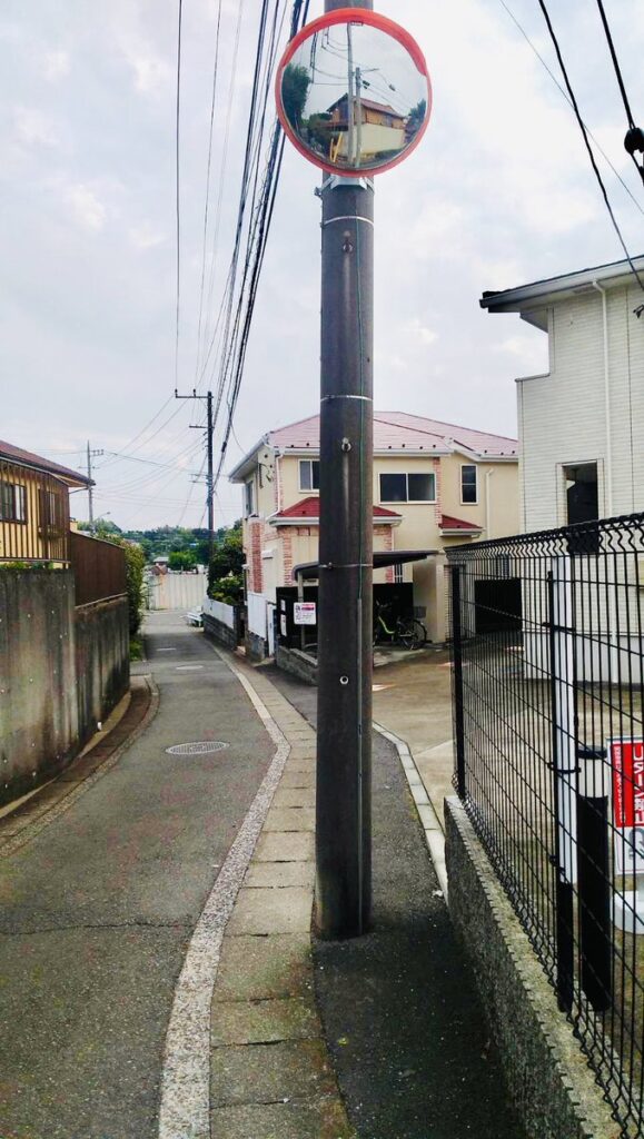 【 カーブミラー 】 東方 源東院 近くの狭い二股に別れる道坂から降りるバイク …